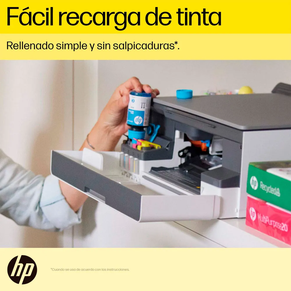 | Incluye | Incluye 5 botellas de tintas: Botella HP Negra GT53(2), Botella HP Cyan GT52, Botella HP Magenta GT52, Botella HP Amarillo GT52 ; Guía de instalación; Guía de referencia; Cable de alimentación. |